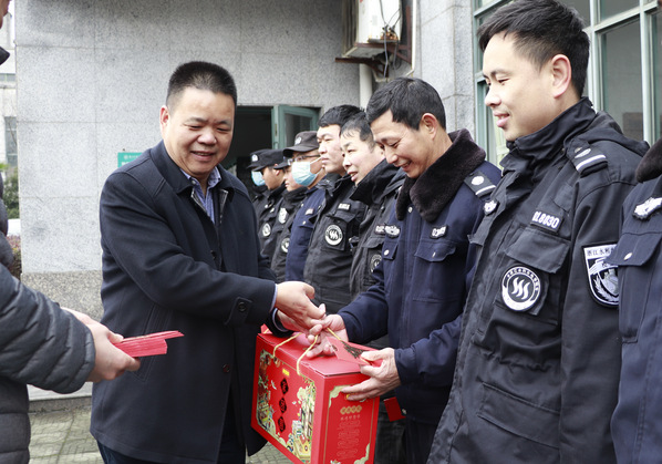 校領導一行先後走訪教學區保衛處、東澤苑一樓食堂等地,每到一處與大家熱情握手,送上祝福和慰問品,代表學校衷心感謝大家一年來的辛勤工作,對他們節日期間仍堅守崗位表示親切慰問。